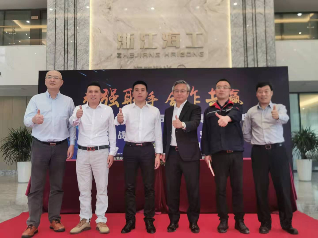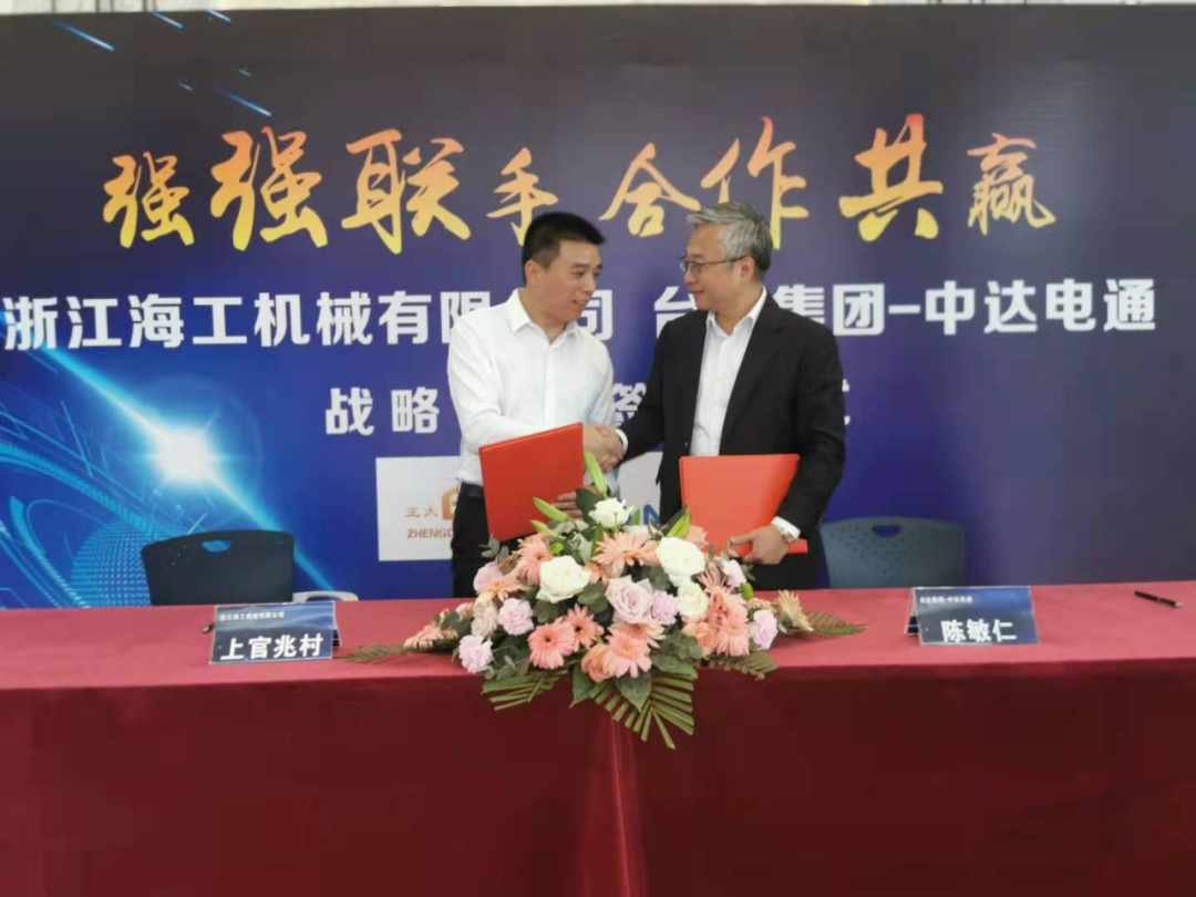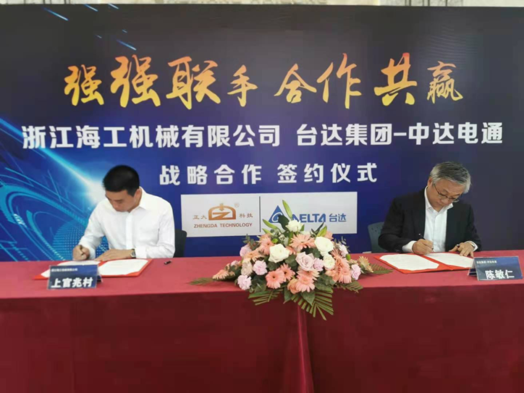 機械與工控強強聯手,海工與臺達合作共贏。4月23日,浙江海工機械一樓大廳熱鬧非凡,海工機械總經理上官兆村與臺灣臺達集團-中達電通機電事業部總經理陳敏仁在此簽訂戰略合作協議。