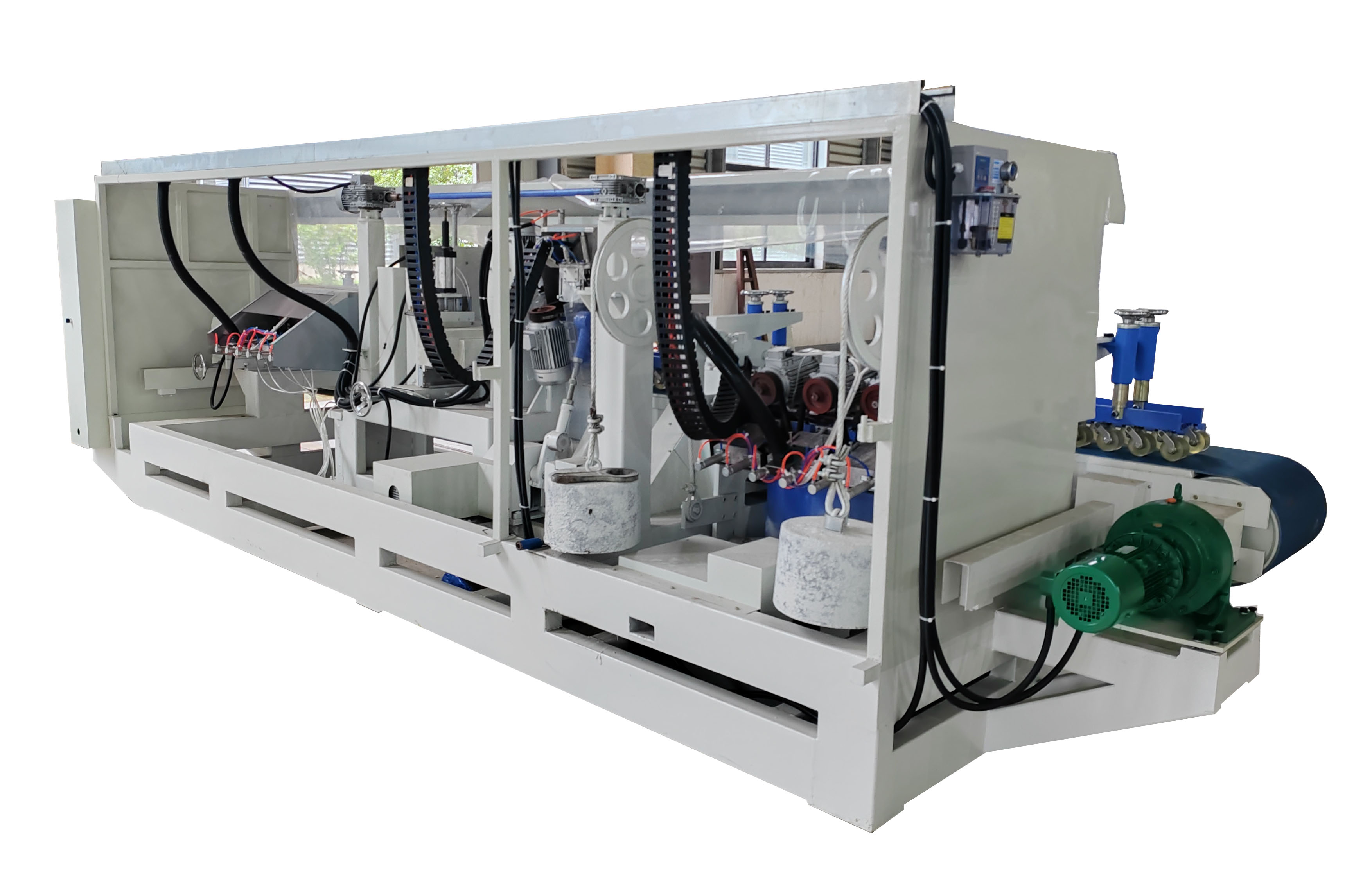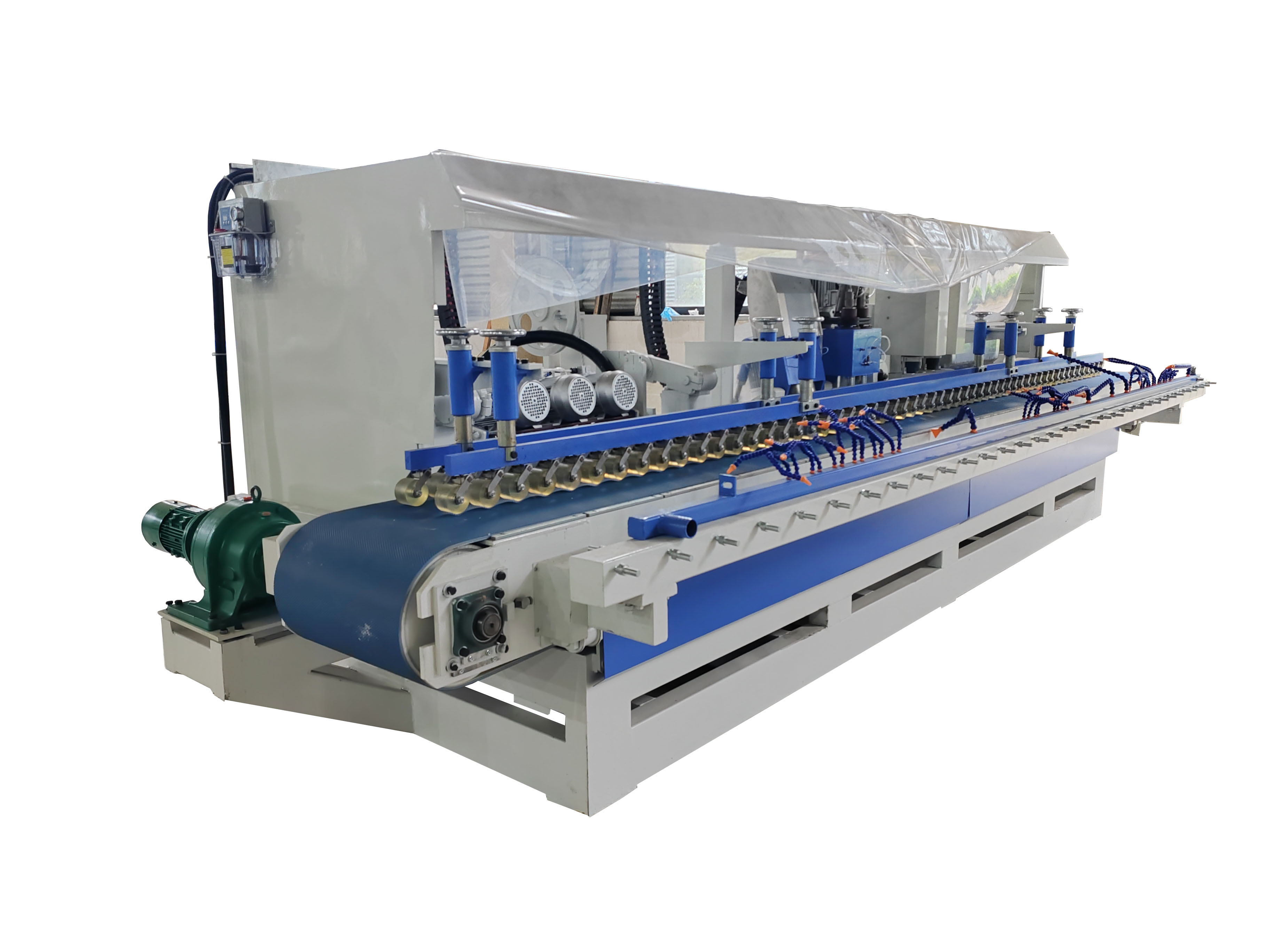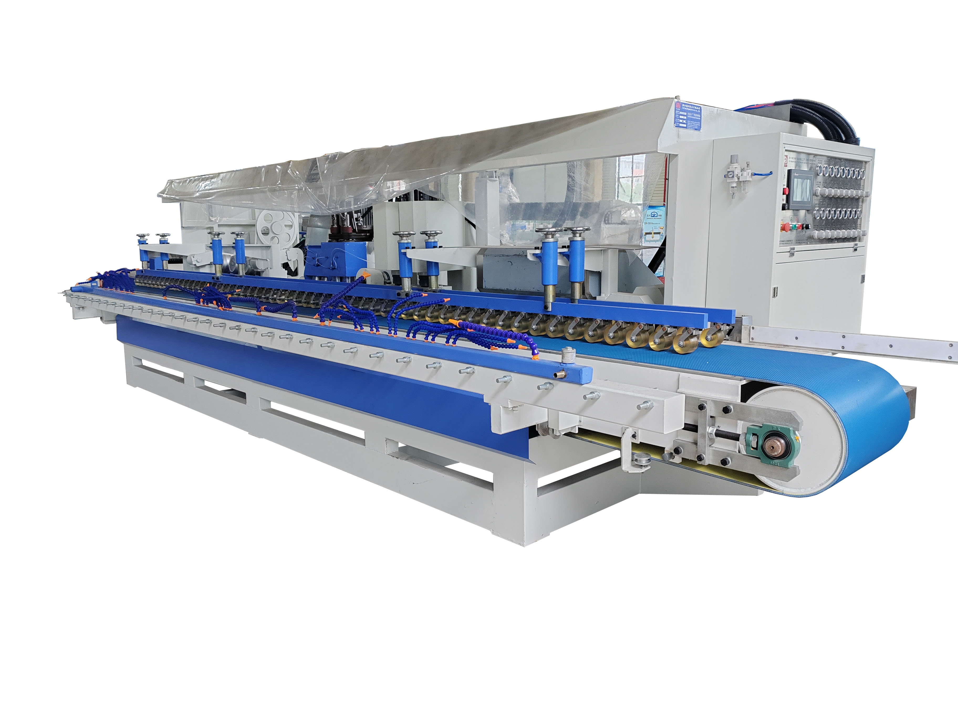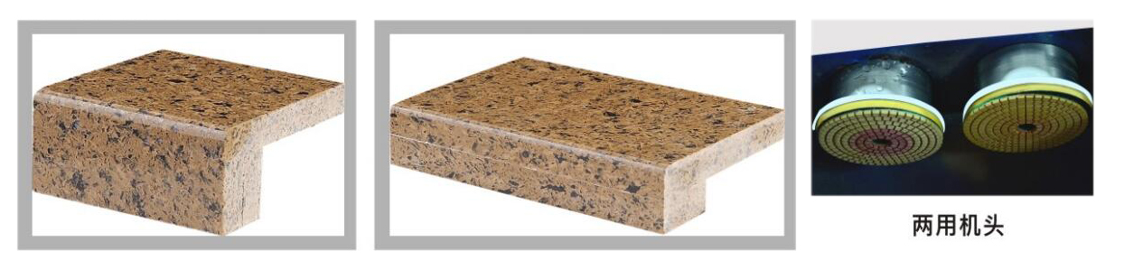 產品說明 一、一次性完成臺面上下角,定厚,開止水槽,以及側面拋光等工序; 二、輸送帶傳動,流水線設計,效率高。